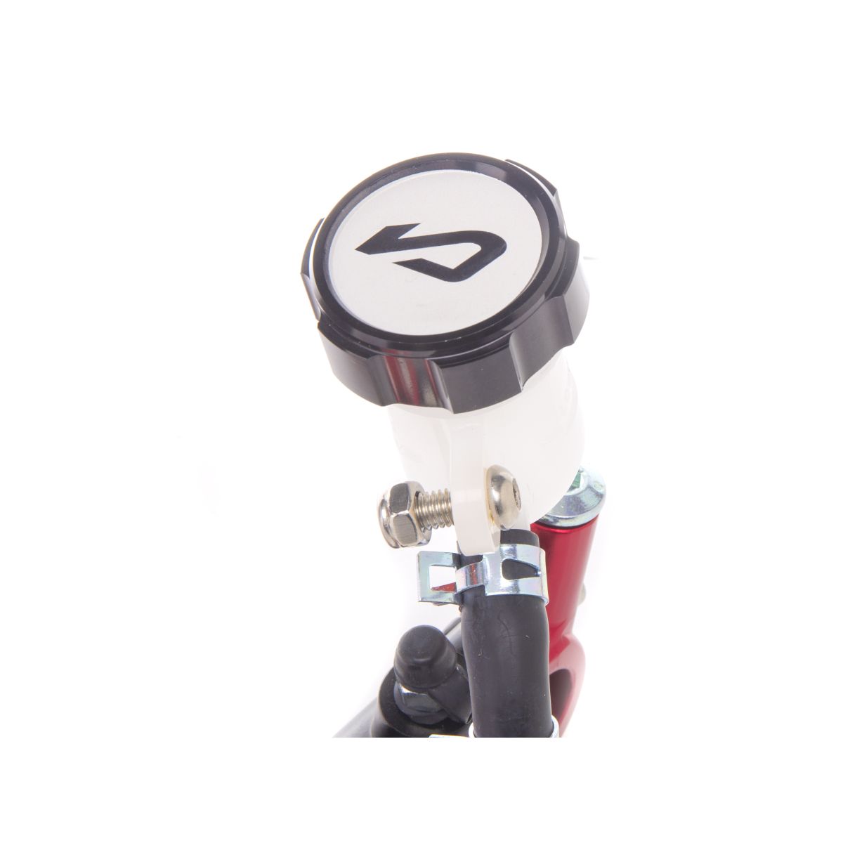 🏁 El cuerpo radial de aluminio integra una toma de llenado, así como una media abrazadera con soporte para retrovisor, facilitando el montaje tanto en carretera como en preparación racing.