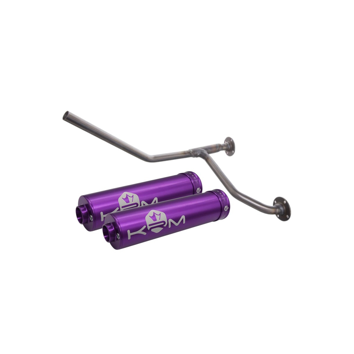 💨 Tubo con doble salida de MOST, con dos silenciadores KRM de aluminio anodizado Lila. Para motos 50cc BETA RR. Este pack está compuesto del kit de fijación de la doble salida, dos abrazaderas de silenciador Ø 60mm así como dos bandas de silicona negras.