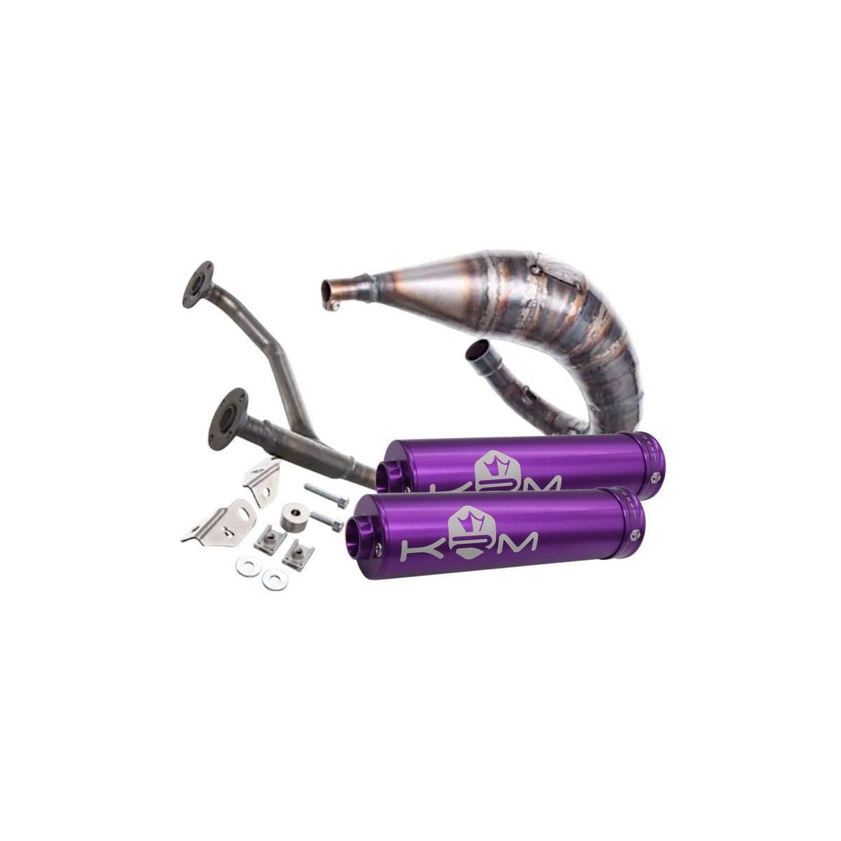 🏍️ Escape Most paso alto 50/70 cc para Beta RR 50 desde 2021, con silenciador KRM Pro Ride lila doble salida 🔧 Ideal para motores 50 a 70 cc. 💨 Para elegir la brida correcta según su kit de cilindro, contáctenos (ø25-32 / ø28-32 / ø32-32).