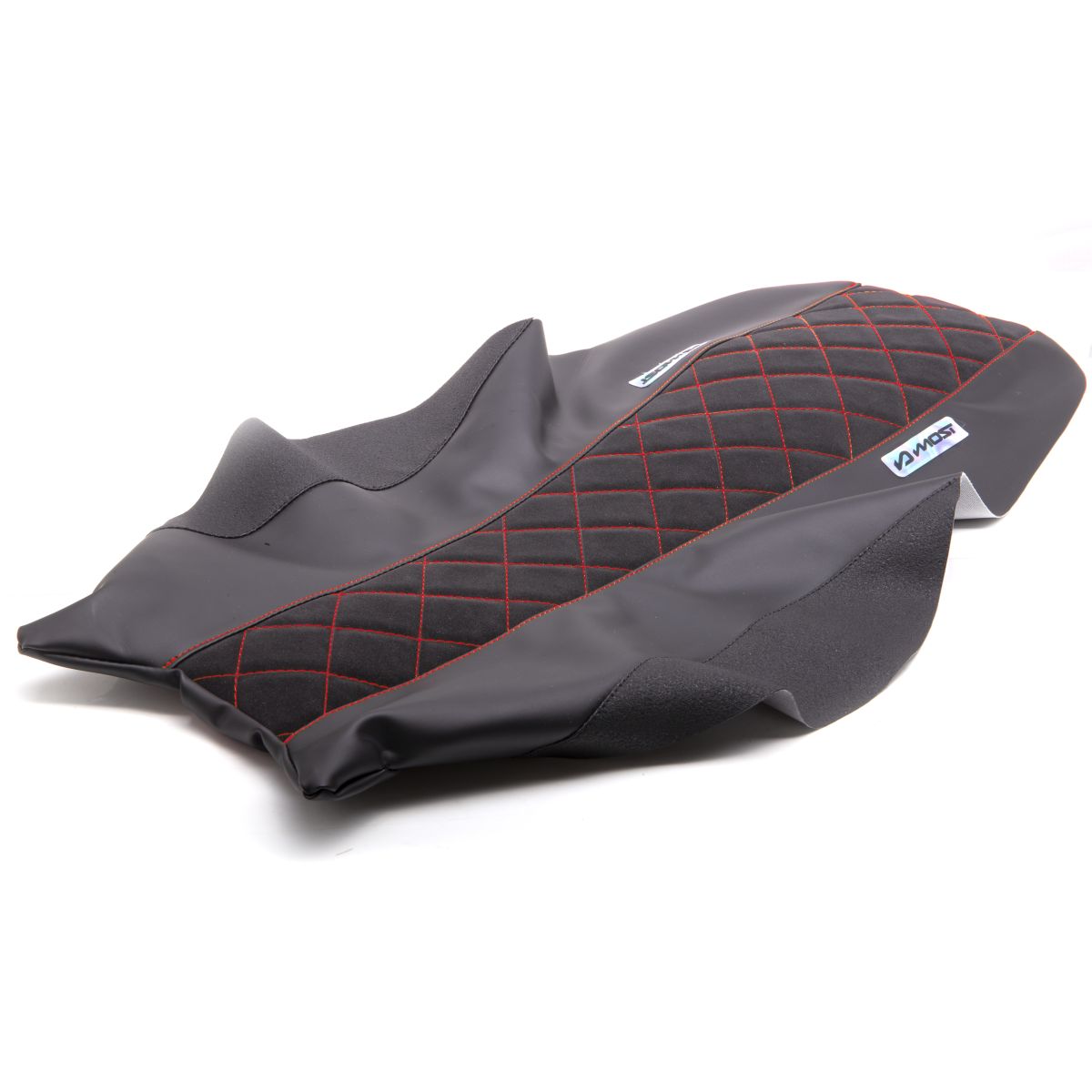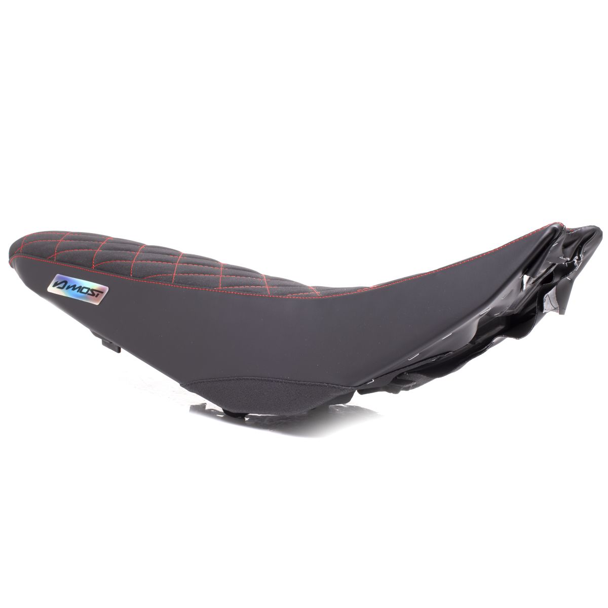 🏍️ Funda de asiento MOST Racing Evo negra con costuras rojas para motos 50cc Derbi y Gilera.