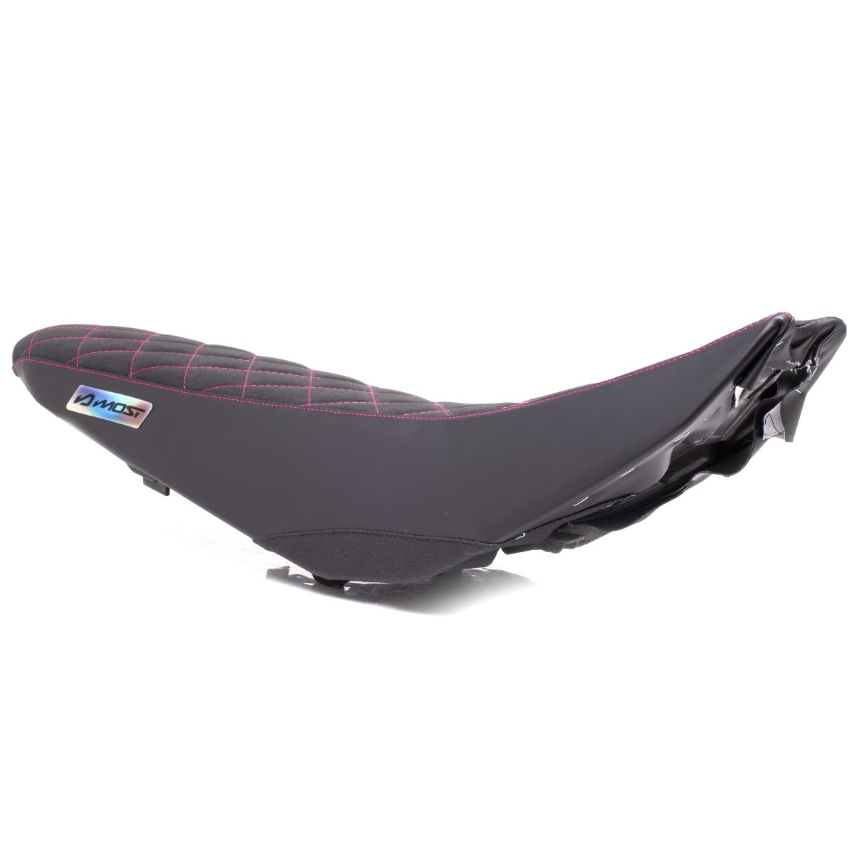 🏍️ Funda de asiento MOST Racing Evo negra con costuras rosas para motos 50cc Derbi y Gilera.