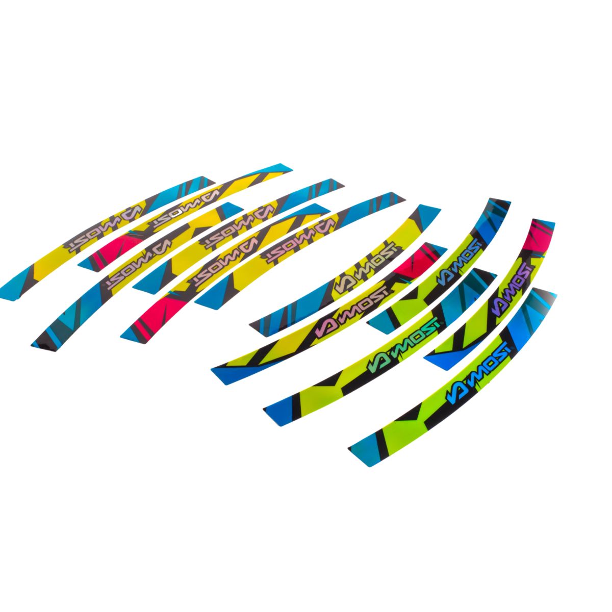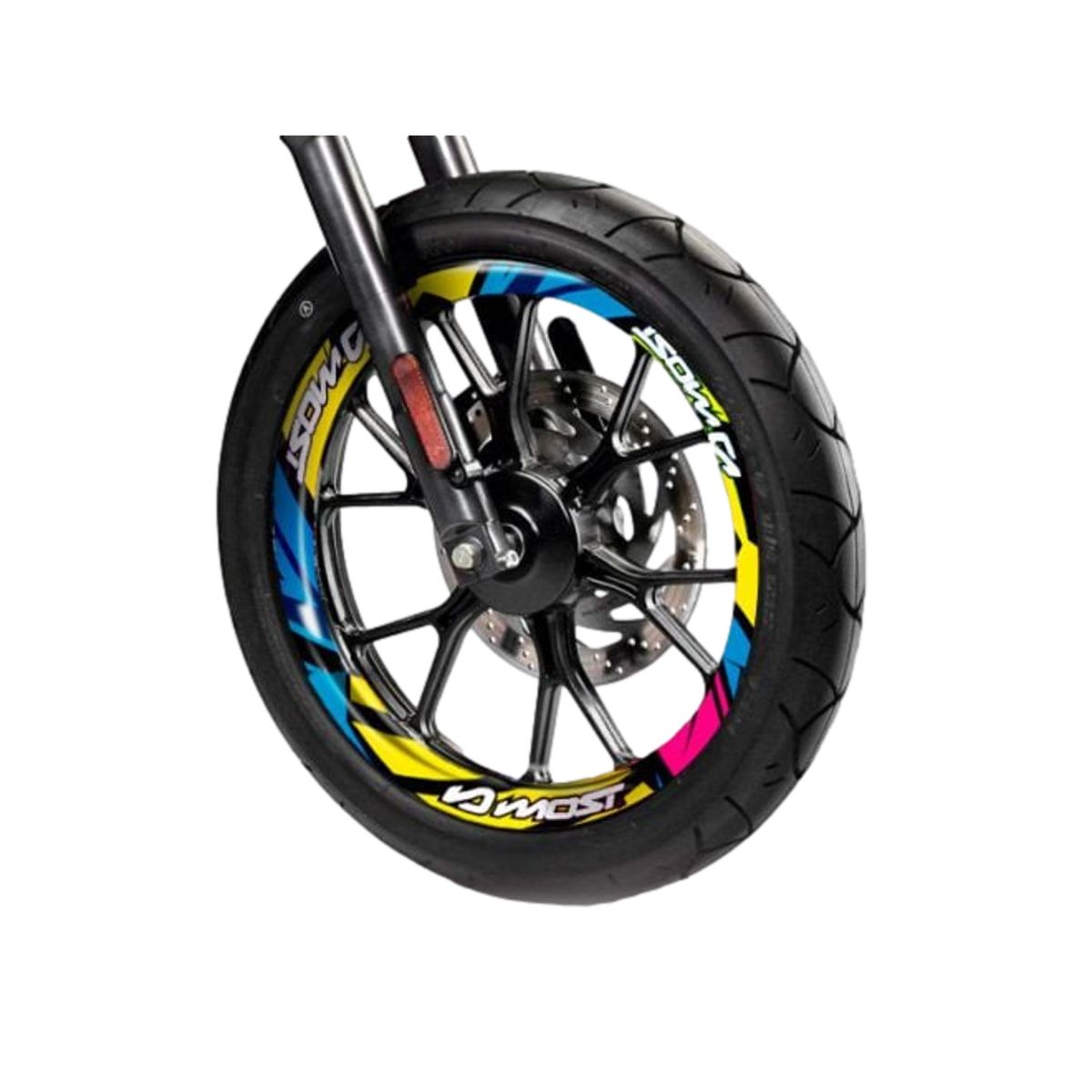 Bixess te presenta este kit de decoración Most para llantas de moto o scooter de hasta 17 pulgadas de diámetro. Gracias a su efecto holográfico y su color rosa, azul, amarillo, podrás personalizar tu vehículo. Este kit cuenta con tratamiento antiarañazos, antisalpicaduras y anti-UV para aumentar su durabilidad. Compuesto por 12 elementos, podrás decorar las llantas delanteras y traseras. Además, este kit es fácil de instalar.
