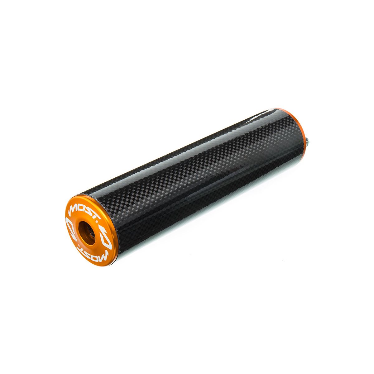 💨 Silenciador MOST de alto rendimiento en aluminio aspecto carbono y naranja para motores 80 a 100cc.