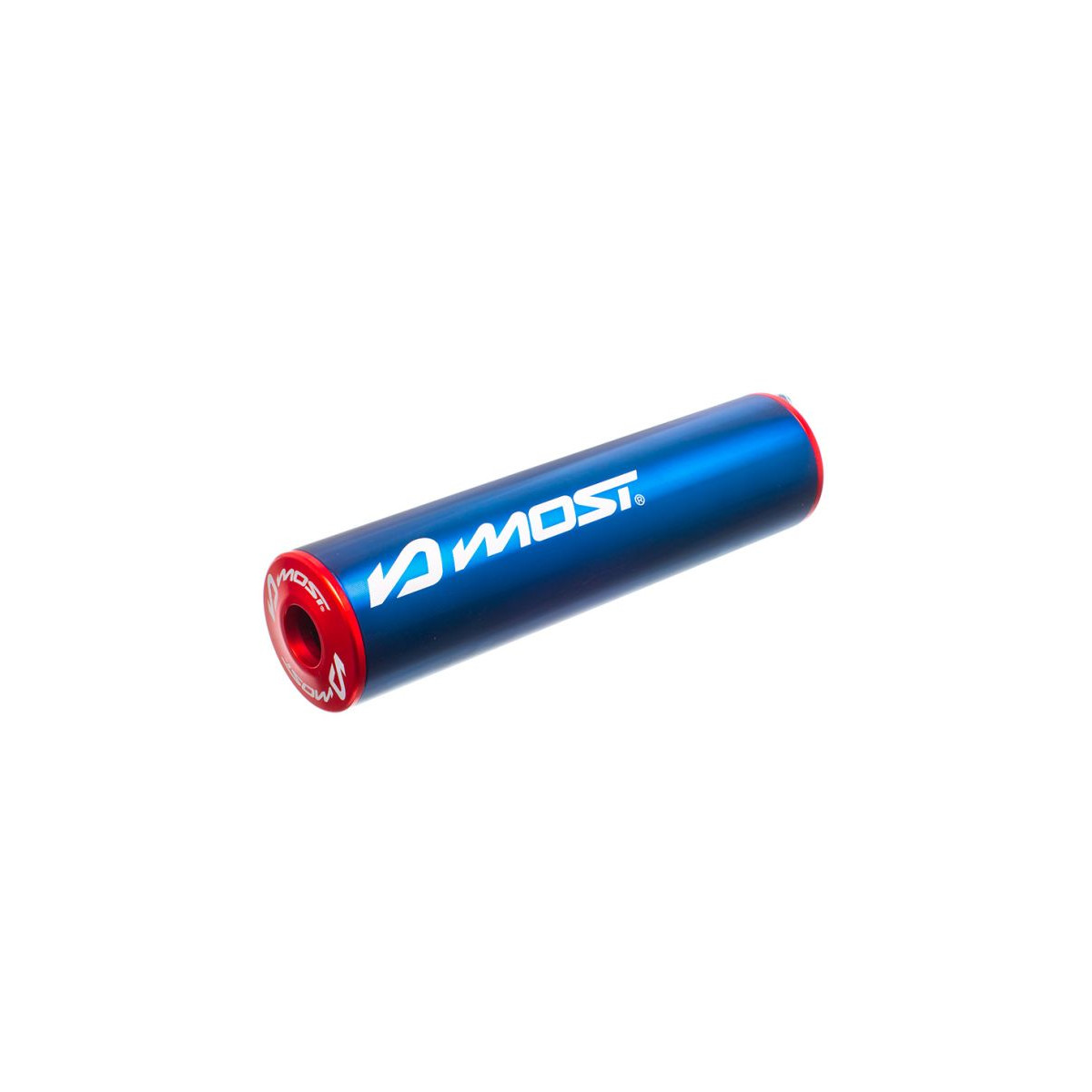 🏁 Silenciador MOST Racing en aluminio, acabado azul noche con tapas rojas, compatible con motores 50cc a 70cc.
