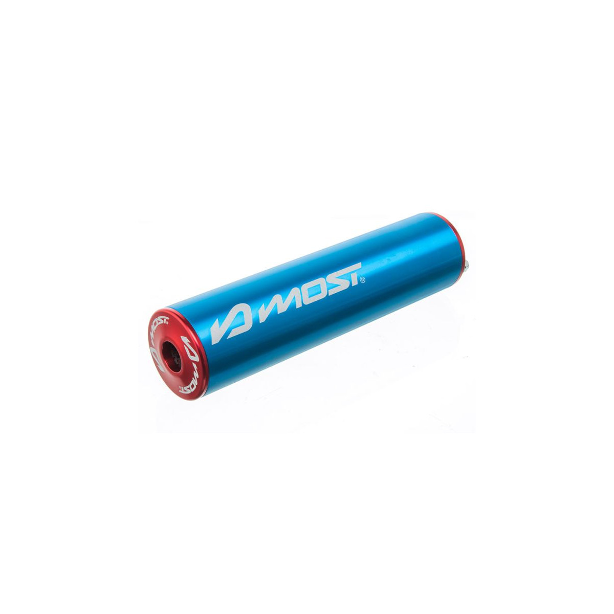 🏁 Silenciador MOST Racing en aluminio, acabado azul con tapas rojas, compatible con motores 50cc a 70cc.