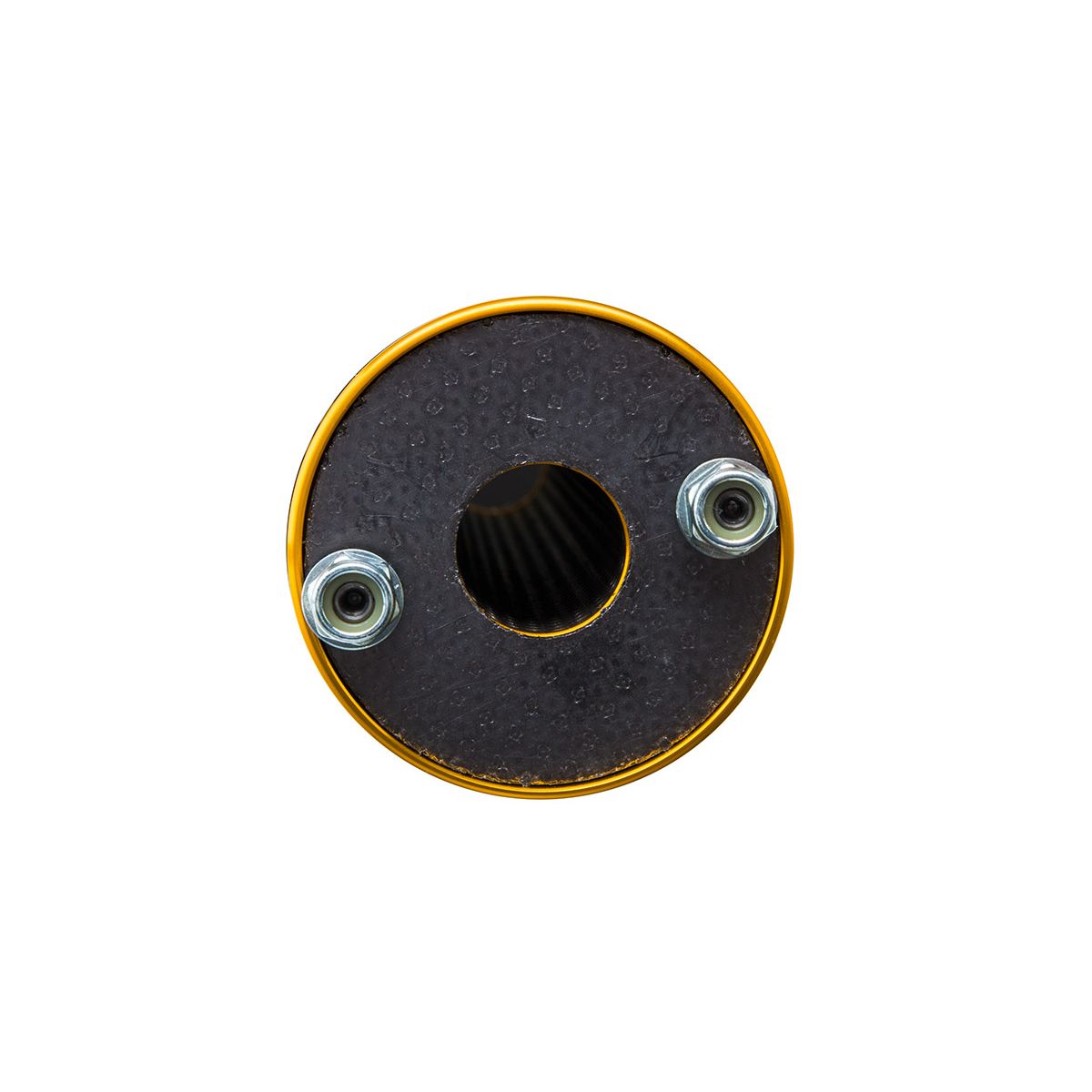 El cuerpo de aluminio mecanizado está anodizado negro y oro, ofreciendo resistencia al calor y acabado duradero. Las cápsulas de entrada y salida, talladas en masa, están equipadas con juntas tóricas para minimizar vibraciones y asegurar estanqueidad. Una junta de papel de 0,8 mm completa la unión con el tubo.