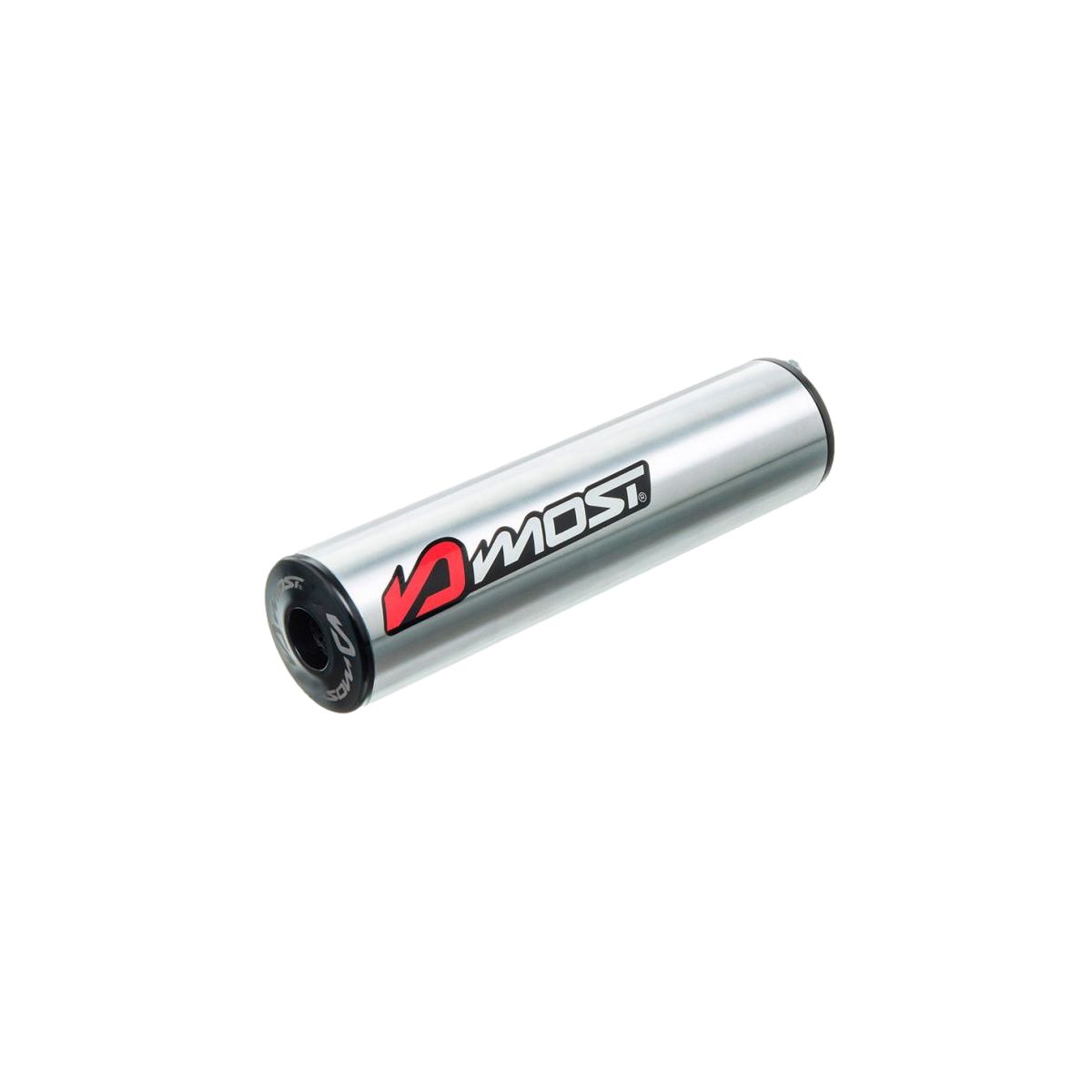 MOST Racing presenta este silenciador de aluminio CNC en colores silver y negro, diseñado para tubos de escape de grandes configuraciones motor 80 a 100 cc.