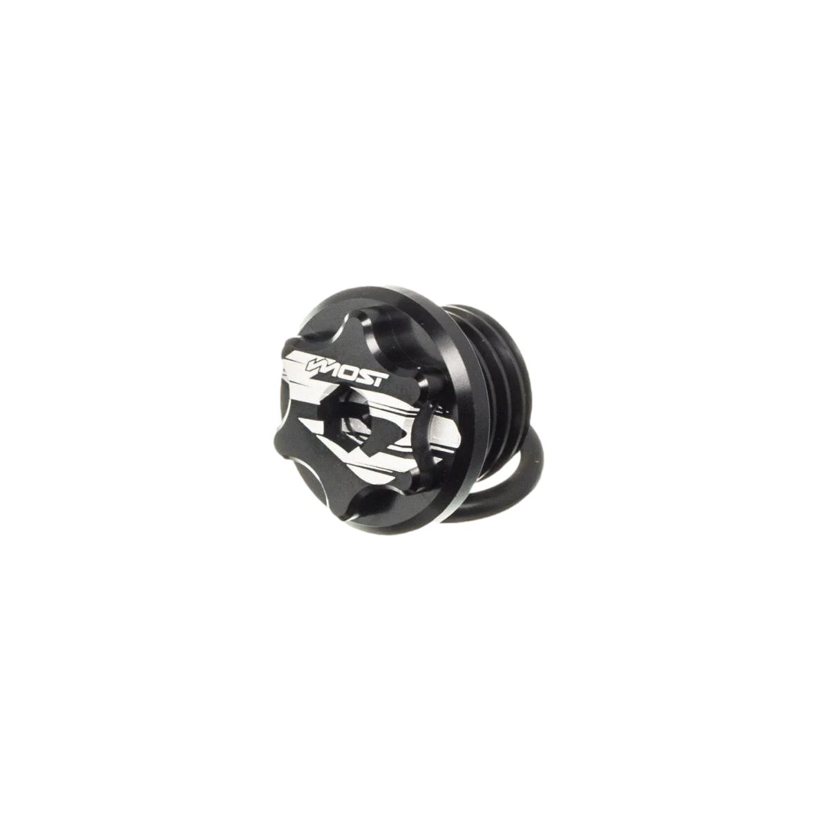 Segunda versión del tapón de cárter de aceite MOST Racing para motos con motor Derbi Euro 2, 3 y 4. Aluminio CNC anodizado, diseño TORX, grabado láser Most, junta tórica y sticker incluidos. ⚫🔧