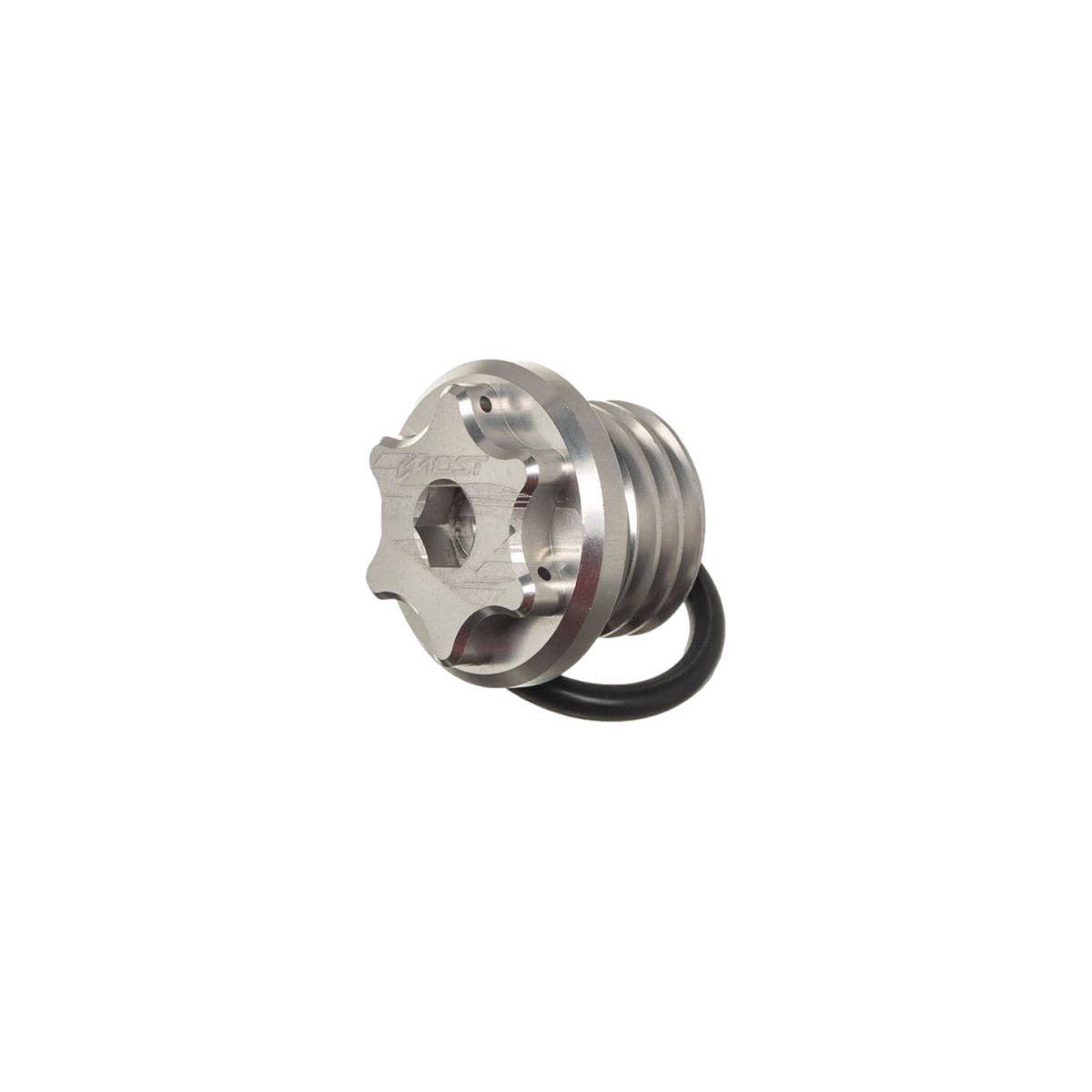 Tapón de cárter V2 Most Racing para motor Minarelli AM6, fabricado en aluminio CNC anodizado gris. Rosca M16 x 2, perforado para freno con alambre, incluye junta tórica. 🔧⚙️