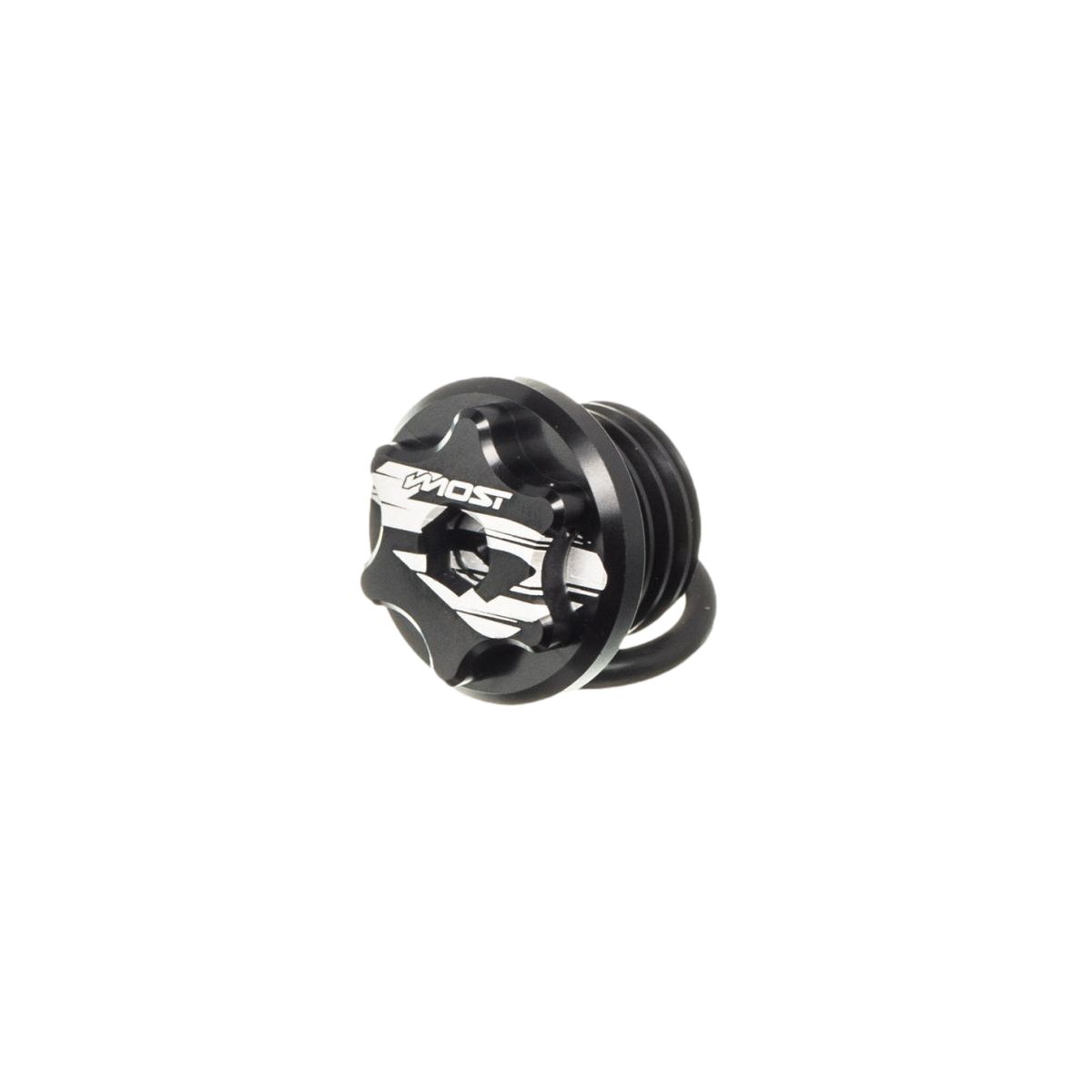 Tapón de cárter V2 Most Racing para motor Minarelli AM6, fabricado en aluminio CNC anodizado negro. Rosca M16 x 2, perforado para freno con alambre, incluye junta tórica. 🔧⚫