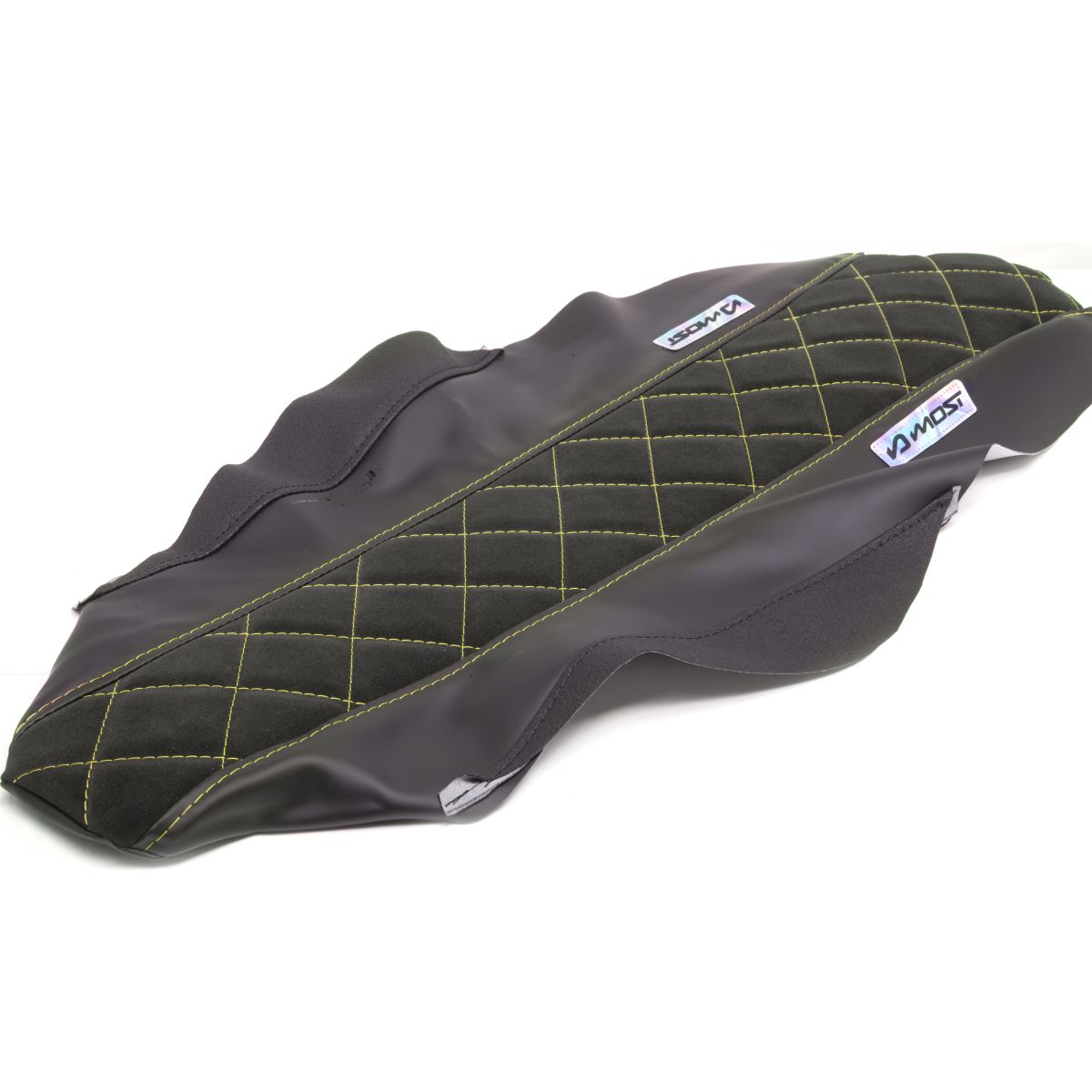 🏁 Les surpiqûres jaunes contrastent avec le noir et donnent à la selle un look supermotard audacieux et sportif. Les flancs en textile plastifié et texturé assurent un maintien parfait des genoux, tandis que le logo MOST holographique cousu apporte une finition premium.