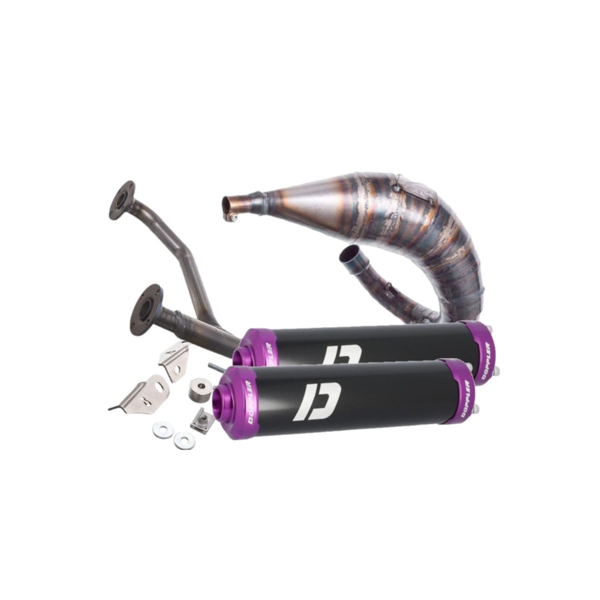🏍️ Pot Most passage haut 50/70 cc pour Beta RR 50 à partir de 2021, livré avec silencieux Doppler noir-violet double sortie 🔧 Compatible moteurs 50 à 70 cc. 💨 Pour choisir la bride adaptée à votre kit cylindre, contactez-nous (ø25-32 / ø28-32 / ø32-32).