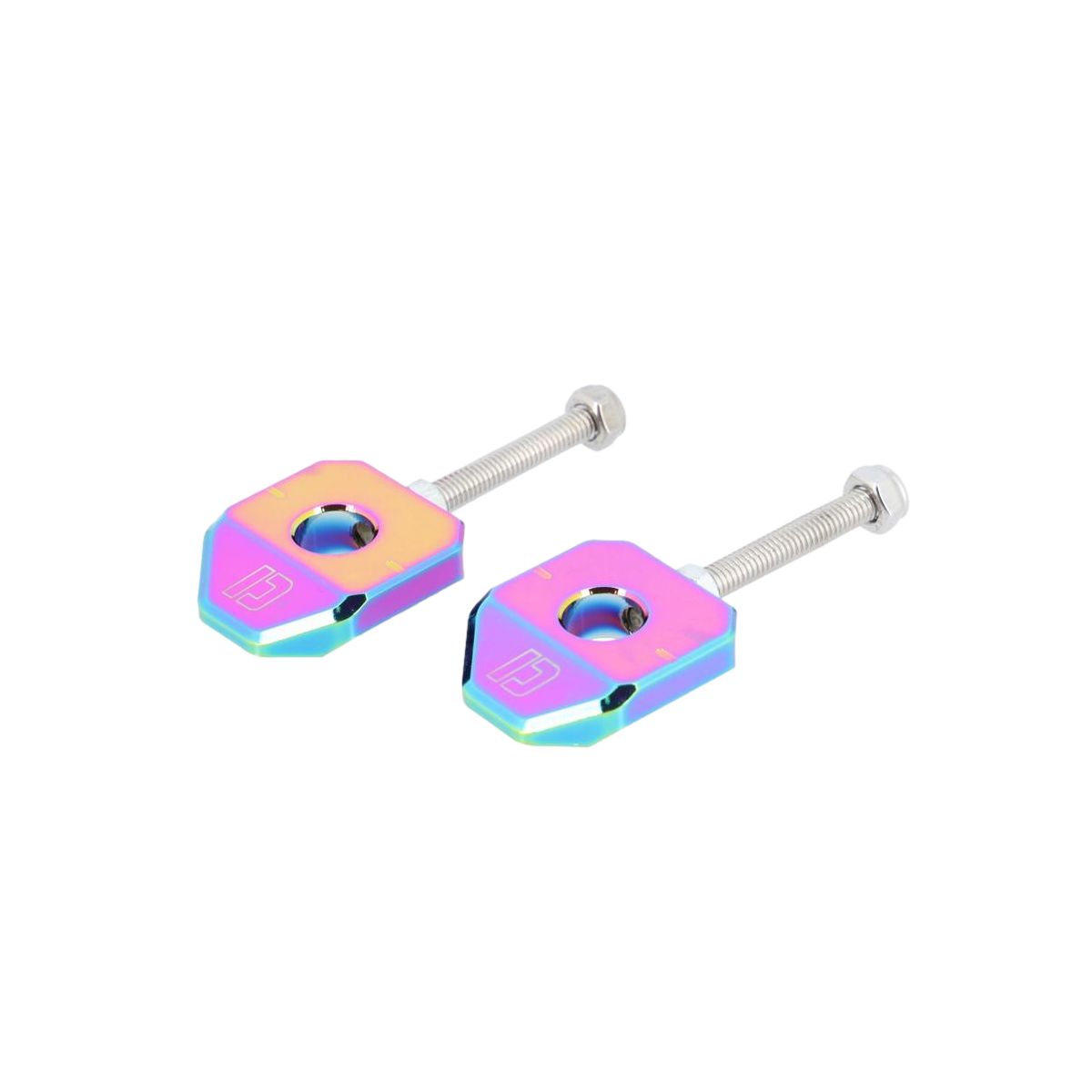 Paire de tendeurs de chaîne fabriqué en aluminium CNC anodisé néochrome pour une personnalisation de votre Derbi Senda jusque dans les moindres détails.