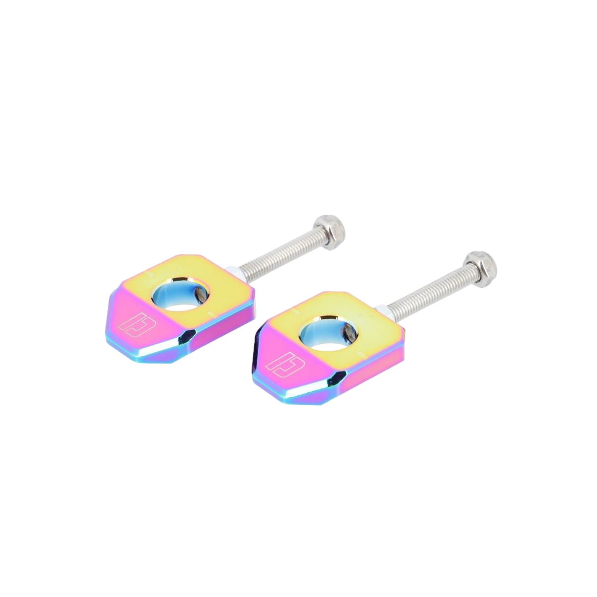 Paire de tendeurs de chaîne fabriqué en aluminium CNC anodisé néochrome pour une personnalisation de votre Derbi Senda jusque dans les moindres détails.